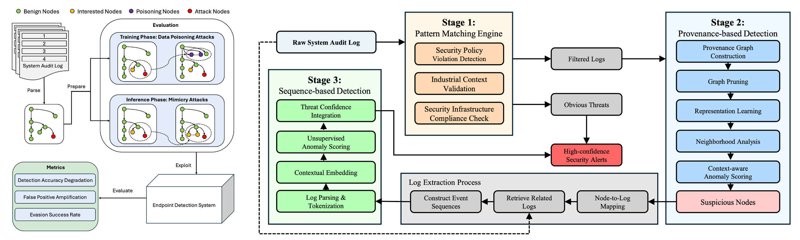 终端作为企业数据的重要入口,易受高级持续性威胁攻击,行业主流的规则基入侵检测系统虽能实现零漏检,却因告警量过大引发告警疲劳,而学术界先进的学习基入侵检测系统虽能兼顾检测率与精准度,却因工业场景下训练数据噪声污染、推理数据对抗性操纵等问题,始终未被行业广泛采纳,形成了技术落地的信任鸿沟。