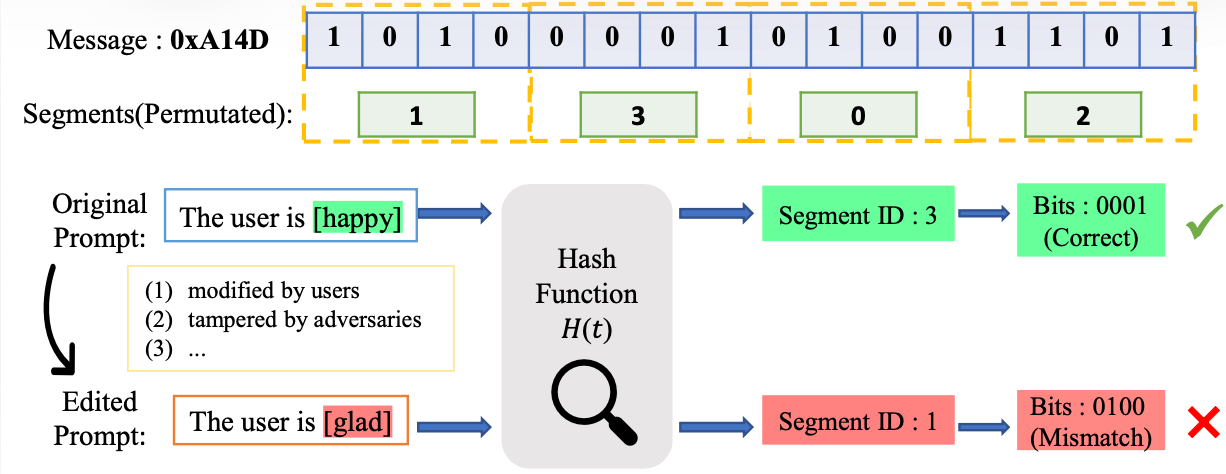 大语言模型(LLM)的广泛应用使得追踪生成内容的来源变得至关重要,以防止虚假信息的传播 。与只能提供二元检测的零比特水印相比,多比特文本水印因其能够提供更细粒度的溯源能力而备受关注 。目前,最先进的多比特水印技术通常采用基于哈希的分配机制将水印比特嵌入到划分的词元(token)空间中 。然而,这种方法存在一种严重的“同步漏洞” 。当用户或攻击者对文本进行如同义词替换(例如将“happy”替换为“glad”)等轻微修改时,语义相同的词元可能会被哈希算法映射到完全不同的水印片段中,从而破坏词元与片段的对齐,轻易导致水印提取失败 。